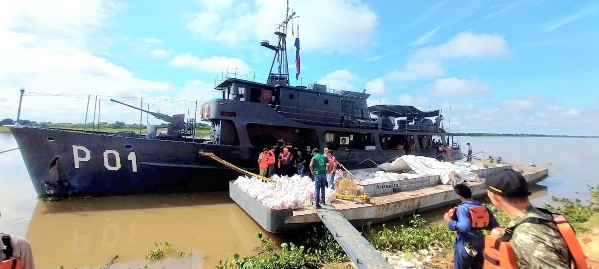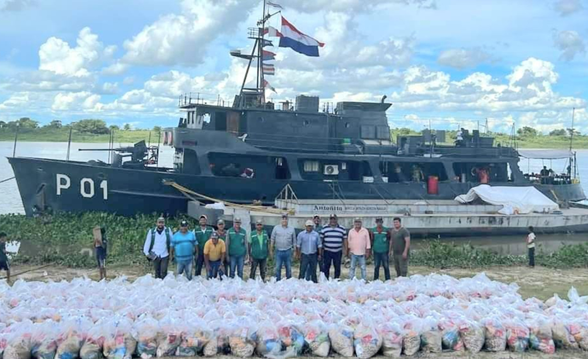 Desembarco del buque P01 Capitán Cabral para segunda entrega de kits de víveres a la comunidad indigena de Puerto Esperanza, distrito de Bahia Negra.