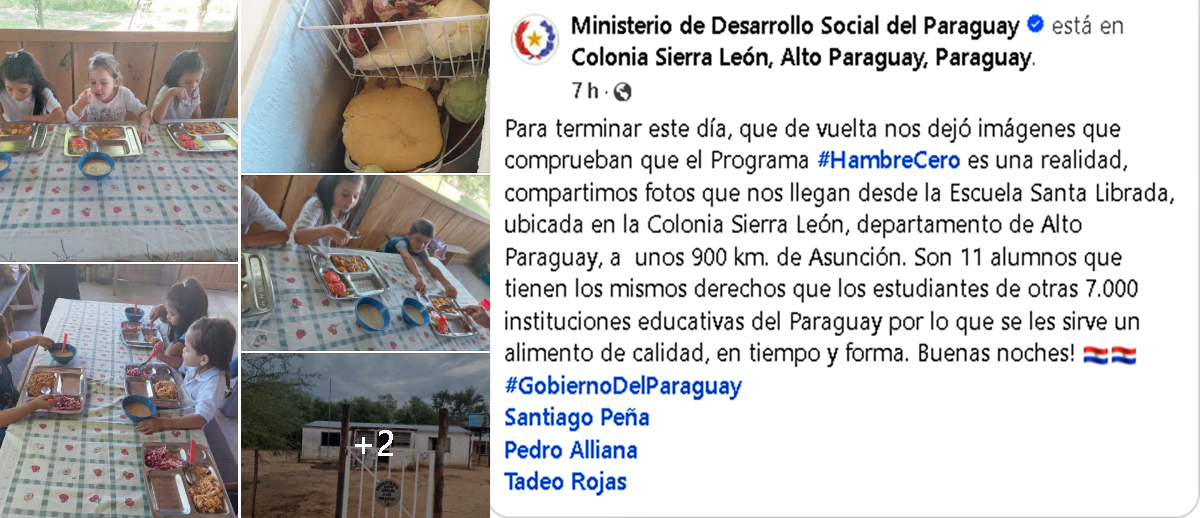 En esta institución, 11 alumnos que tienen los mismos derechos que los estudiantes de otras 7.000 instituciones educativas del Paraguay recibieron su alimento de calidad, en tiempo y forma, por consecuencia estamos orgullosos de demostrar que SI PODEMOS, sin excusas, cuando hay honestidad y transparencia.