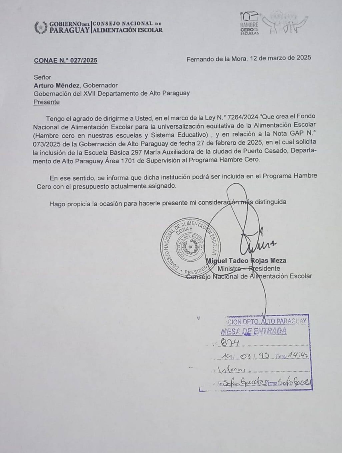 24/03/25: Mediante gestiones realizadas por el gobernador Arturo Mendez, ante el MECDigital – Ministerio de Educación y Ciencias – Paraguay y el Ministerio de Desarrollo Social del Paraguay, pudimos conseguir la aprobación para la inclusión de la Esc. Básica 297 María Auxiliadora de Puerto Casado al Programa Hambre Cero.