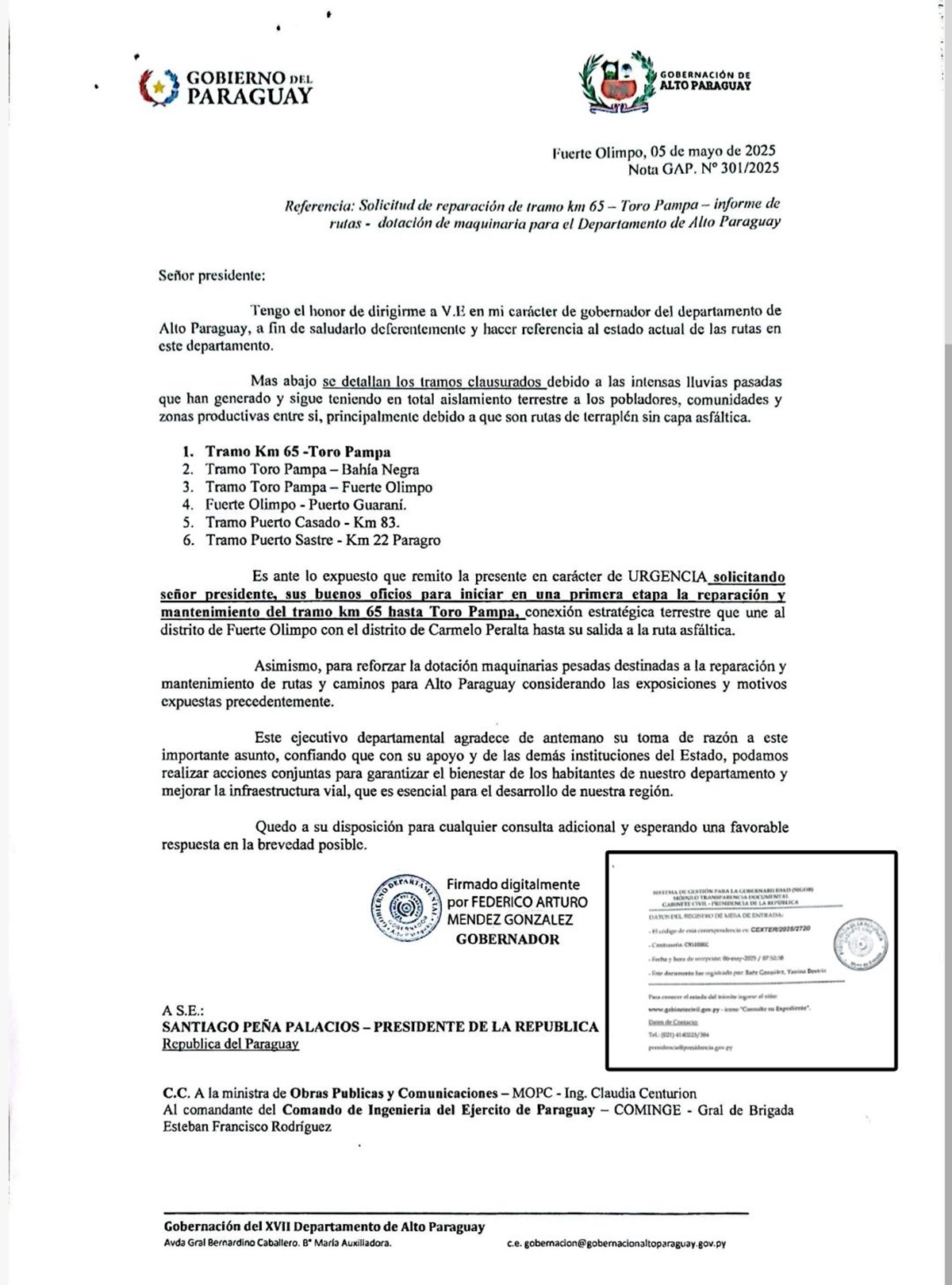 16/05/25: El Gobernador Arturo Méndez, mediante nota oficial con mesa de entrada de fecha 6 de mayo, ha solicitado al Presidente de la República la urgente intervención para la reparación de los tramos viales gravemente afectados por las intensas lluvias que han azotado a nuestro departamento.